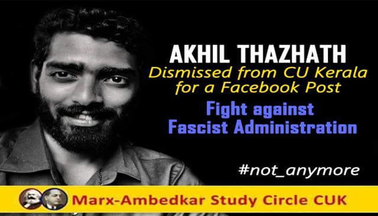 ഹോസ്റ്റലിലെ പാചകക്കാരെ പുറത്താക്കിയതിനെതിരെ സര്വ്വകലാശാല വിദ്യാര്ത്ഥിയായ അഖില് താഴത്ത് ഫേസ്ബുക്കില് പോസ്റ്റ് ഇട്ടതോടെ അധികാരികള് അഖിലിനെതിരെ തിരിഞ്ഞു. അഖില് ഇത് സംമ്പന്ധിച്ച് പറയുന്നത് ഇങ്ങനെയാണ്, ജൂണ് 22 ന് സര്വ്വകാലാശാലയിലെ ഹോസ്റ്റലിലെ പാചകത്തൊഴിലാളിയെ പുറത്താക്കിയതിനെതിരെ ഫേസ്ബുക്കില് പോസ്റ്റ് എഴുതിയിരുന്നു. വിദ്യാര്ത്ഥികളുമായി പ്രത്യേകിച്ച്, എനിക്ക് വ്യക്തിപരമായി ബന്ധമുള്ള ഹോസ്റ്റലിലെ പാചകത്തൊഴിലാളികളെ പുറത്താക്കിയതിനെതിരെ കുറിച്ച് മാത്രമായിരുന്നു എഴുതിയിരുന്നത്. ഈ പോസ്റ്റില് സര്വ്വകലാശാലയ്ക്കെതിരെ ഒന്നും എഴുതിയിരുന്നില്ല. എന്നാല് ജൂലൈ 22 നാണ് സര്വ്വകലാശാല എന്നെ ഹിയറിങ്ങിന് വിളിക്കുന്നത്.