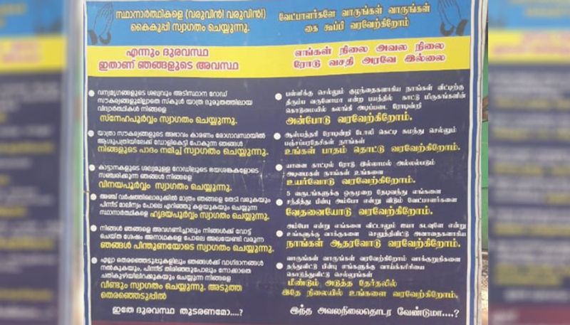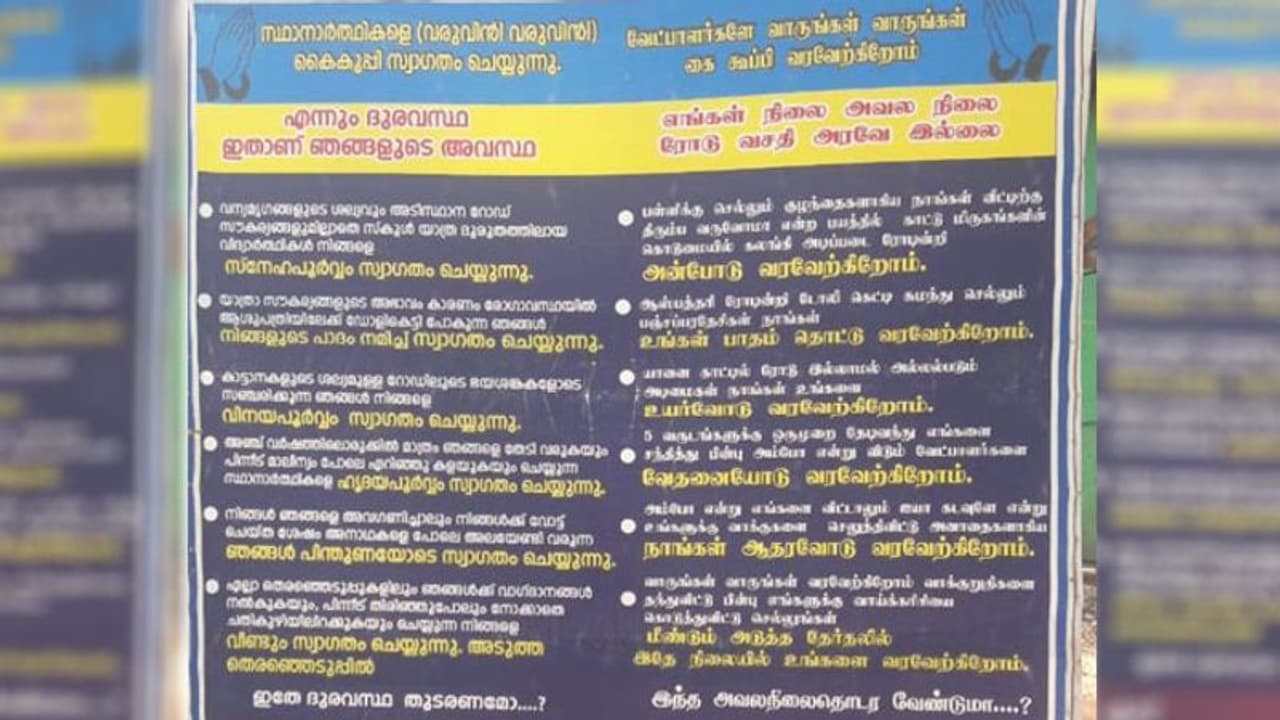 നിങ്ങള് ഞങ്ങളെ അവഗണിച്ചാലും നിങ്ങള്ക്ക് വോട്ട് ചെയ്ത ശേഷം അനാഥകളെപോലെ അലയേണ്ടിവരുന്ന ഞങ്ങള് പിന്തുണയോടെ സ്വാഗതം ചെയ്യുന്നു. എല്ലാ തെരഞ്ഞെടുപ്പിലും വാഗ്ദാനങ്ങള് നല്കുകയും പീന്നീട് തിരിഞ്ഞുനോക്കാതെ ചതിക്കുഴില് തള്ളിവിടുകയും ചെയ്യുന്ന നിങ്ങളെ വീണ്ടും സ്വാഗതം ചെയ്യുന്നു. ഇതേ ദുരവസ്ഥ തുടരണമോയെന്ന് ചോദിച്ചാണ് പോസ്റ്റര് അവസാനിക്കുന്നത്.