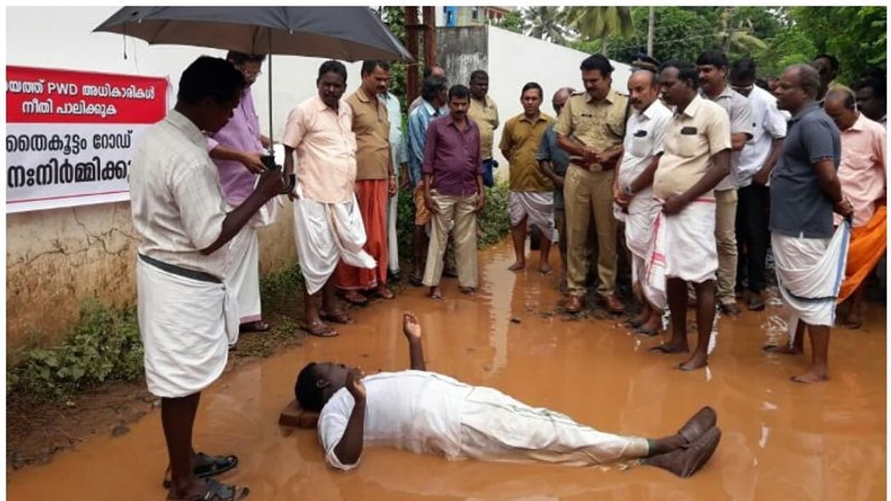 പഞ്ചായത്തിലെ നിരവധി ആളുകൾ നിത്യേന സഞ്ചരിക്കുന്ന തൈക്കൂടം ഫെറി റോഡിന്റെ ശോചനീയാവസ്ഥ കണ്ടിട്ടും കാണാതെ പോകുന്ന അധികൃതരുടെ അനാസ്ഥയ്ക്കെതിരെയാണ് പരിസരവാസിയായ ഷൈലജൻ കാട്ടിത്തറ പൊട്ടി തകർന്ന റോഡിലെ ചെളിവെള്ളത്തില് കിടന്ന് പ്രതിഷേധിച്ചത്.