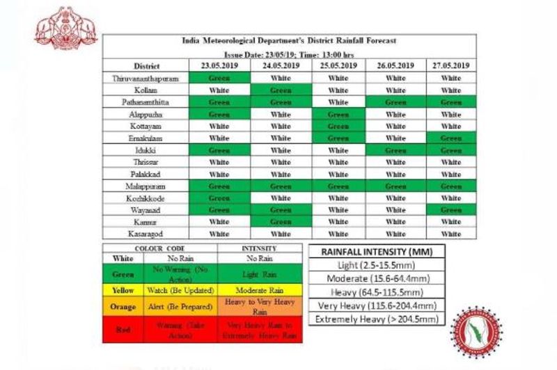 മെയ് 24 വരെ കേരളത്തിലെ ചില ജില്ലകളിലെ ഒറ്റപ്പെട്ട സ്ഥലങ്ങളിൽ വൈകുന്നേരങ്ങളിൽ ഇടിയോടുകൂടിയ ശക്തമായ മഴ ഉണ്ടാകും.