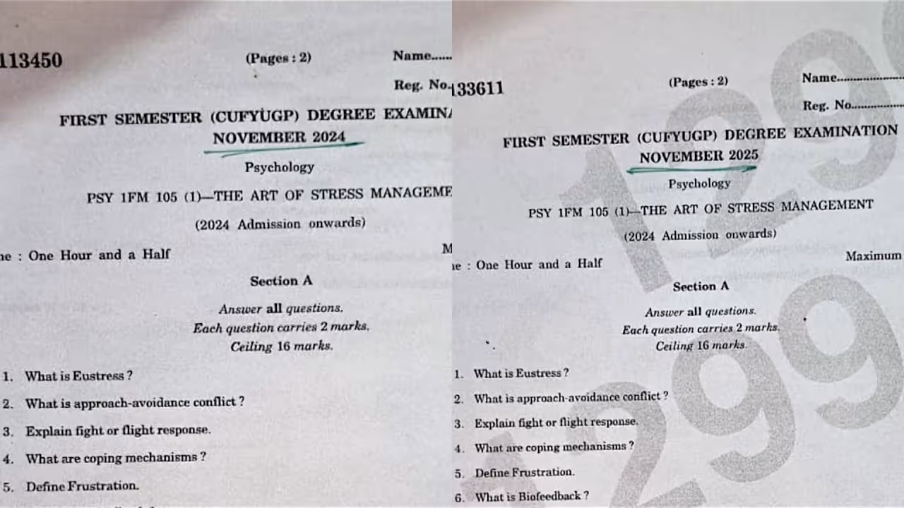 എംഡിസി സൈക്കോളജി ഒന്നാം സെമസ്റ്റർ പരീക്ഷയിലെ ചോദ്യ പേപ്പറിലാണ് ഗുരുതര വീഴ്ച ഉണ്ടായത്. കഴിഞ്ഞ വർഷത്തെ അതെ ചോദ്യപ്പേറാണ് ഇത്തവണയും പരീക്ഷയ്ക്ക് നൽകിയത്.