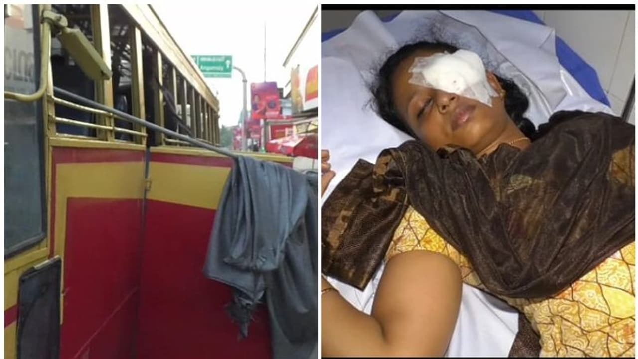 കൊട്ടാരക്കരയ്ക്ക് പോകുന്ന അടൂര് ഡിപ്പോയിലെ ആര് എസ് സി 487 നമ്പര് ഫാസ്റ്റ് പാസഞ്ചര് ബസിലേക്കാണ് ഇരുമ്പ് കമ്പി കയറിയത്. ചങ്ങനാശേരിയിലെ സര്ക്കാര് ആയുര്വ്വേദ ആശുപത്രിയിലെ നഴ്സായ യുവതി ജോലി കഴിഞ്ഞ്ചെങ്ങന്നൂരിലെ വീട്ടിലേയ്ക്ക് പോകുകയായിരുന്നു. എംസി റോഡില് കെഎസ് ആര് ടി സി ബസ്സ്റ്റാന്റിനു സമീപം സ്വകാര്യ ആശുപത്രിയോട് ചേര്ന്ന ബേക്കറിയുടെ ഇറക്കിക്കെട്ടില് നിന്നും റോഡിലേയ്ക്ക് നീണ്ടു നിന്ന കമ്പിയാണ് യുവതിയുടെ കണ്ണിലേയ്ക്ക് തുളച്ചു കയറിയത്.