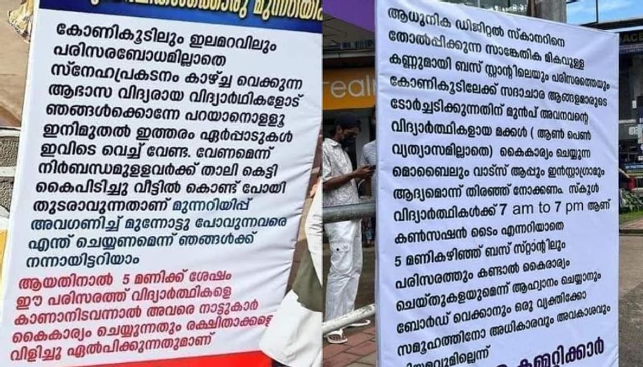 എടവണ്ണ: 'വിദ്യാർഥികൾ ജാഗ്രത പാലിക്കണം' അഞ്ചുമണിക്ക് ശേഷം ഈ പരിസരത്ത് കണ്ടാൽ കൈകാര്യം ചെയ്യും, മലപ്പുറം ജില്ലയിലെ എടവണ്ണ ബസ് സ്റ്റാൻഡിൽ സദാചാര പൊലീസിന്റെ മുന്നറിയിപ്പ് ബോർഡ്. ഈ നൂറ്റാണ്ടിലേക്ക് വണ്ടി കിട്ടാത്തവർക്ക് ചുട്ട മറുപടിയുമായി വിദ്യാർത്ഥികളും. ഒടുവിൽ പ്രശ്നം വഷളാകാതെ എടവണ്ണ പൊലീസ് എത്തി രണ്ട് ഫ്ലക്സ് ബോർഡുകളും എടുത്തുമാറ്റി. വിദ്യാർഥികൾക്കൊരു മുന്നറിയിപ്പ് എന്ന പേരിൽ മലപ്പുറം എടവണ്ണ ബസ്സ്റ്റാൻഡിന് മുമ്പിൽ പ്രത്യക്ഷപെട്ട ബോർഡ് സമൂഹ മാധ്യമങ്ങളിലും വലിയ ചർച്ചയായിരുന്നു.