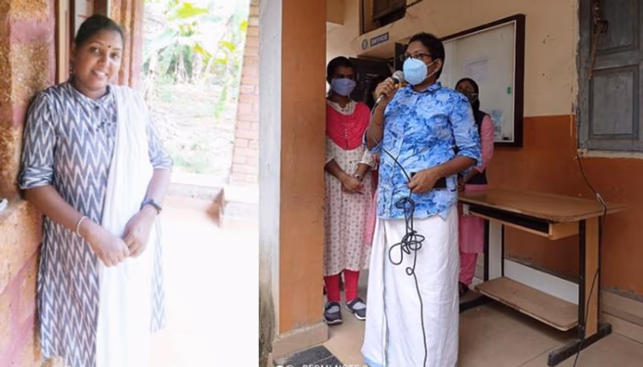 പലവിഷയങ്ങളിലും കാലങ്ങളായി വിചാരണയ്ക്ക് വിധേയമാകുന്ന ഒന്നാണ് സ്ത്രീകളുടെ വസ്ത്രധാരണം. പതിവ് രീതികളില് നിന്ന് നേരിയ മാറ്റം ഉണ്ടാവുന്നത് പലപ്പോഴും ചോദ്യം ചെയ്യപ്പെടലിനും വിചാരണയ്ക്കും വരെ വഴി തെളിക്കുന്ന ഈ കാലത്ത് സ്കൂളിലേക്ക് ഷര്ട്ടും മുണ്ടും ധരിച്ചെത്തിയ അധ്യാപിക(Teacher wore dhoti and shirt to school) ചര്ച്ചയാവുന്നു. നൂറുവര്ഷത്തിലേറെ പാരമ്പര്യമുള്ള പാലക്കാട്ടെ(Palakkad) ഏറ്റവും വലിയ ഗേള്സ് സ്കൂളുകളിലൊന്നായ ഗവണ്മെന്റ് മോയന്സ് ഗേള്ഡ് ഹയര് സെക്കന്ഡറി സ്കൂളിലാണ് (Govt. Moyan Model Girl's Higher Secondary School) പ്ലസ്ടു അധ്യാപിക ഷര്ട്ടും മുണ്ടും ധരിച്ചെത്തിയത്. മുക്കം സ്വദേശിനിയും എഴുത്തുകാരിയുമായ ലിസ പുല്പറമ്പിലാണ് (Lisa Pulparambil)വേറിട്ട വേഷത്തില് പ്രവേശനോത്സവത്തില് പങ്കെടുത്തത്.