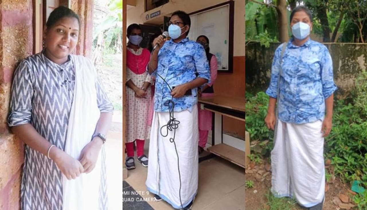 നീല ഡിസൈനുള്ള ഷര്ട്ടും മുണ്ടും ഒപ്പം പറ്റേ വെട്ടിയ മുടിയുമായാണ് ലിസ ടീച്ചര് സ്കൂളിലെത്തിയത്. രണ്ട് മാസം മുന്പാണ് ലിസ ടീച്ചര് ക്യാന്സര് രോഗികള്ക്ക് വിഗ് നിര്മ്മിക്കുന്നതിനായി മുഴുവന് മുടിയും ദാനം ചെയ്തത്. മുണ്ട് എന്ന് പറയുന്നത് പുരുഷന്മാരുടെ വസ്ത്രം മാത്രമല്ല. ഇപ്പോഴും തൊഴിലാളി സ്ത്രീകള് മുണ്ട് ഉപയോഗിക്കുന്നുണ്ട്. അല്ലാതെ വളരെ പ്ലാന് ചെയ്ത് വിലകുറഞ്ഞ രീതിയിലുള്ള പ്രശസ്തിക്ക് വേണ്ടിയായിരുന്നില്ല മുണ്ടുടുക്കാനുള്ള തീരുമാനമെന്നും ലിസ ടീച്ചര്
