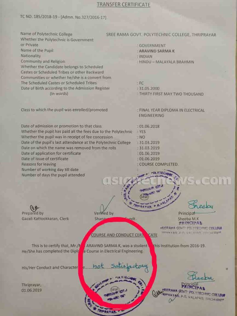 മുല്ലശ്ശേരി ഗവ.എച്ച്എസ്എസിലെ സീനിയര് അധ്യാപകനായ എന് കൃഷ്ണശര്മ്മയുടെയും സ്വകാര്യ ഇന്ഷുറന്സ് സ്ഥാപനത്തിലെ ഉദ്യോഗസ്ഥയായ കെ എന് പ്രീതയുടെയും മകന് കെ അരവിന്ദ് ശര്മ്മയ്ക്കാണ് ഈ ദുര്വിധി. ക്യാമ്പസിലും പുറത്തും നവമാധ്യമങ്ങളിലും ചിരിപ്പിക്കുകയും ചിന്തിപ്പിക്കുകയും ചെയ്യുന്ന മികച്ച ട്രോളറാണ് അരവിന്ദ്. തൃപ്രയാര് ശ്രീരാമ പോളിടെക്നിക്കില് നിന്ന് 2016-19 കാലയളവില് ഇലട്രിക്കല് ബാച്ചില് പഠിച്ചിറങ്ങിയപ്പോഴാണ് അരവിന്ദ് ശര്മ്മയ്ക്ക് കോഴ്സ് സര്ട്ടിഫിക്കറ്റിന്റെ കൂടെയുള്ള സ്വഭാവ സര്ട്ടിഫിക്കറ്റില് പ്രതികൂല വിശേഷണം നല്കിയത്. ഇത് അരവിന്ദിന്റെ തുടര്വിദ്യാഭ്യാസത്തിനും തടസമായിരിക്കുകയാണിപ്പോള്.