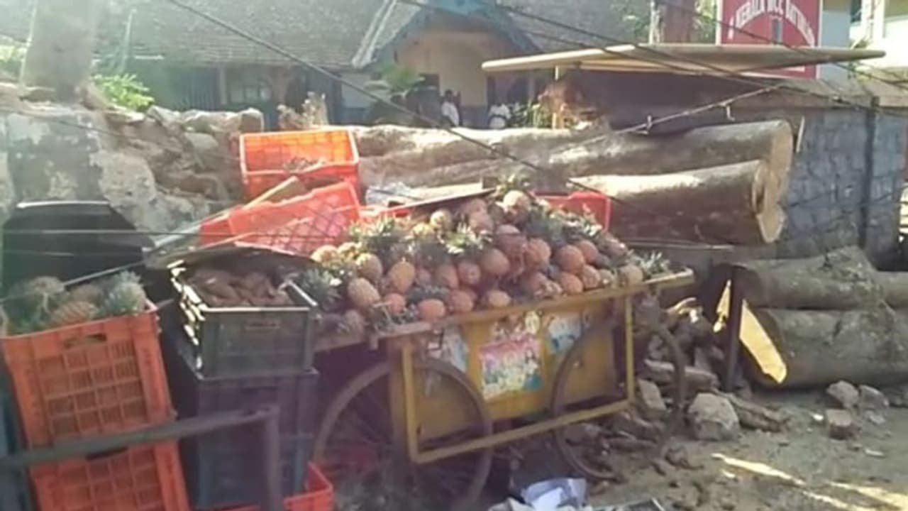 തിങ്കളാഴ്ച വൈകുന്നേരം 3.35 ഓടെയാണ് റോഡിലേക്ക് മരം കടപുഴകി വീണത്. സ്കൂൾ മതിലിനോട് ചേർന്ന് റോഡിൽ തങ്കമണി എന്ന വിധവ പഴവർഗ്ഗങ്ങൾ വിൽക്കുന്ന ഉന്തു വണ്ടിക്കും മുകളിലേക്കാണ് മതിൽ തകർത്ത് മരം വീണത്. ശബ്ദം കേട്ട് തങ്കമണി ഓടി മാറിയതിനാൽ മരത്തിനടിയിൽപ്പെടാതെ രക്ഷപ്പെടുകയായിരുന്നു. ഇവരുടെ കട പൂർണ്ണമായും തകർന്നു.