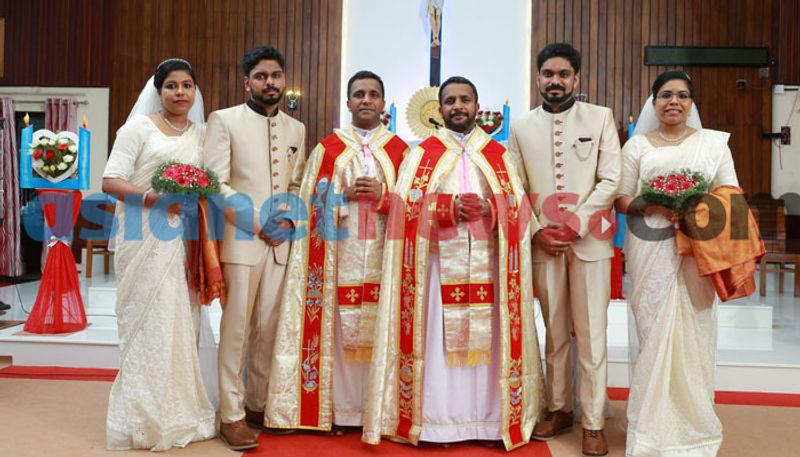 പേരാമ്പ്ര: ഇരട്ടസഹോദരന്മാര്ക്ക് ഇരട്ട സഹോദരിമാര് വധുക്കളായെത്തിയപ്പോള് വിവാഹം ആശീര്വ്വദിക്കാനെത്തിയത് ഇരട്ടകളായ യുവ വൈദികര്. കിടങ്ങൂര് കട്ടച്ചിറ സ്വദേശി ജോസുകുട്ടി ആലീസ് ദമ്പതികളുടെ മക്കളുടെ വിവാഹത്തിനാണ് അപൂര്വ്വ സംഭവം.