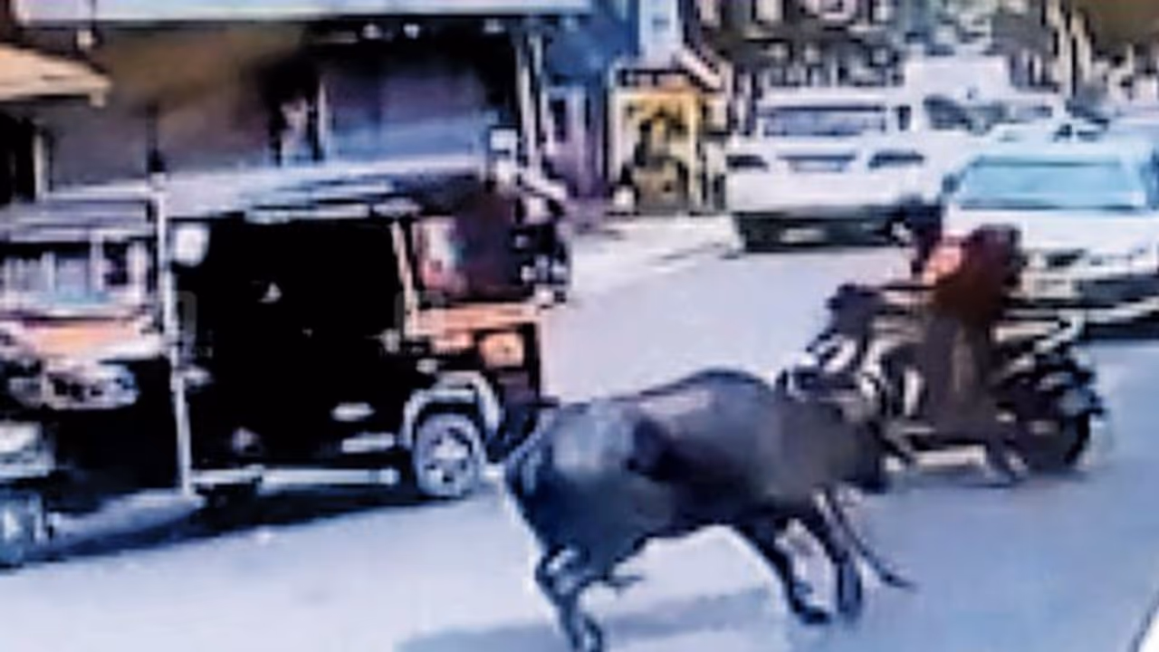 റോഡിലിറങ്ങിയ പോത്ത് ഇരുചക്രവാഹനം മറിച്ചു. യാത്രക്കാരന് ഓടി രക്ഷപ്പെട്ടു. ഏറെ നേരെയാണ് നഗരത്തില് പോത്ത് ആശങ്ക സൃഷ്ടിച്ചത്. നാട്ടുകാര് തളയ്ക്കാന് ശ്രമിച്ചെങ്കിലും നടന്നില്ല. ആരുടേതാണ് പോത്തെന്നും എവിടെനിന്നാണ് വന്നതെന്നും വ്യക്തമല്ല. മാഞ്ഞാലി ഭാഗത്തുനിന്നാണ് പോത്ത് കെട്ടുപൊട്ടിച്ച് വന്നതെന്ന് സൂചനയുണ്ട്. പൊലീസിനും പോത്തിനെ സംബന്ധിച്ച് വിവരമൊന്നും ലഭിച്ചിട്ടില്ല. വ്യാപാര സ്ഥാപനങ്ങള്ക്കും യാത്രക്കാര്ക്കും വാഹനങ്ങള്ക്കും ഏറെ നേരമാണ് പോത്ത് പൊല്ലാപ്പുണ്ടാക്കിയത്.