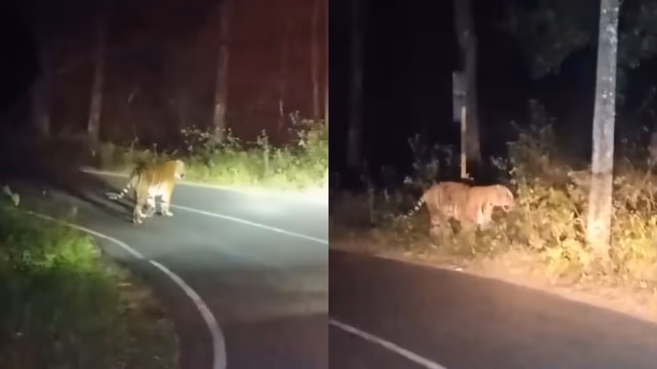 സുൽത്താൻബത്തേരി പാട്ടവയൽ റോഡിൽ രാത്രിയിൽ കടുവയിറങ്ങി. കാർ യാത്രക്കാർ പകർത്തിയ ദൃശ്യങ്ങളിൽ, വാഹനങ്ങളെ കൂസാതെ റോഡിലൂടെ നടന്നുനീങ്ങുന്ന കടുവയെ കാണാം. നൂൽപ്പുഴയ്ക്കും മുണ്ടക്കൊല്ലിക്കും ഇടയിലുള്ള ആനപ്പാലത്തിന് സമീപമാണ് കടുവയെ കണ്ടത്.