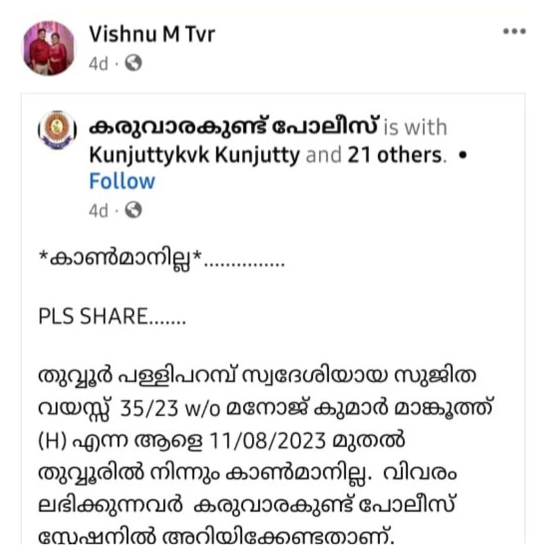 മലപ്പുറം: മലപ്പുറം തുവ്വൂരില് സുജിതയെ കൊലപ്പെടുത്തി വീട്ടു മുറ്റത്ത് തന്നെ കുഴിച്ചിട്ട പ്രതി വിഷ്ണു സുജിതയെ 'കണ്ടെത്താന്' സഹായിക്കണെന്ന് അഭ്യര്ത്ഥിച്ച് ഫേസ്ബുക്കില് ഒന്നിലേറെ പോസ്റ്റുകളും ഇട്ടിരുന്നു. കരുവാരക്കുണ്ട് പൊലീസ് സുജിതയെ കണ്ടെത്താന് സഹായിക്കണമെന്ന് ആവശ്യപ്പെട്ട് ഫേസ്ബുക്കില് പോസ്റ്റ് ചെയ്ത അറിയിപ്പും ഏതാനും ദിവസങ്ങള്ക്ക് മുമ്പ് ഇയാള് ഫേസ്ബുക്കില് ഷെയര് ചെയ്തിരുന്നു. ഇന്നലെ കേസിന്റെ ചുരുളഴിഞ്ഞപ്പോള് വിഷ്ണുവും അച്ഛന് മുത്തുവും സഹോദരങ്ങളായ വൈശാഖ്, ജിത്തു എന്നിവരും സുഹൃത്ത് ഷിഹാനും അറസ്റ്റിലായി.