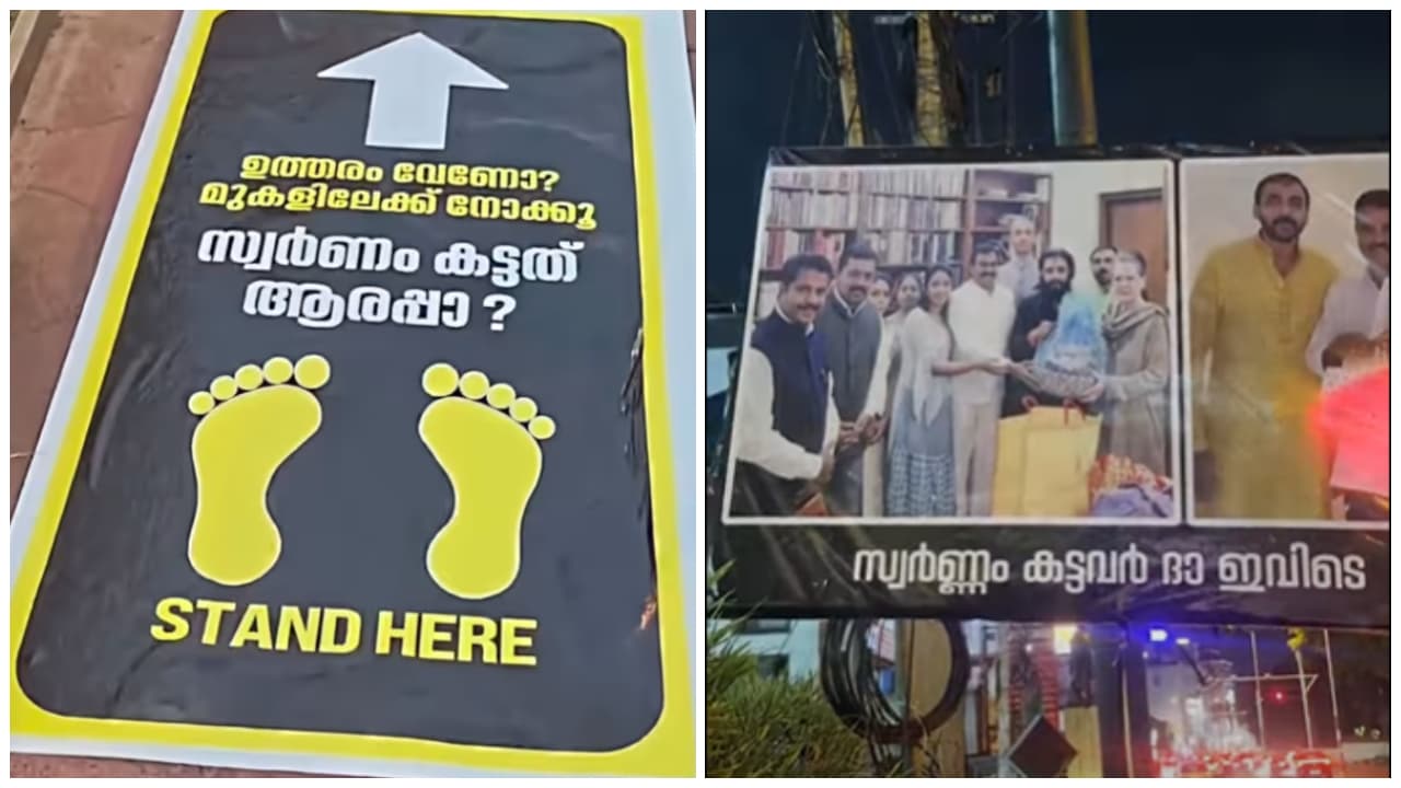 അതുകൊണ്ട് ഡിവൈഎഫ്ഐ ഉത്തരം കൂടെ നൽകുന്നുവെന്ന് പറഞ്ഞ് സോണിയ ഗാന്ധിക്കൊപ്പമുള്ള ശബരിമല സ്വര്ണ്ണ കൊള്ള കേസിലെ പ്രതികളുടെ ചിത്രമാണ് ഡിവൈഎഫ് പതിച്ചിട്ടുള്ളത്. ഉണ്ണികൃഷ്ണൻ പോറ്റിയടക്കമുള്ളവര് അടൂര് പ്രകാശിനും സോണിയ ഗാന്ധിക്കും ഒപ്പം നിൽക്കുന്ന ചിത്രമാണ് ഡിവൈഎഫ്ഐ ഒട്ടിച്ചിട്ടുള്ളത്.