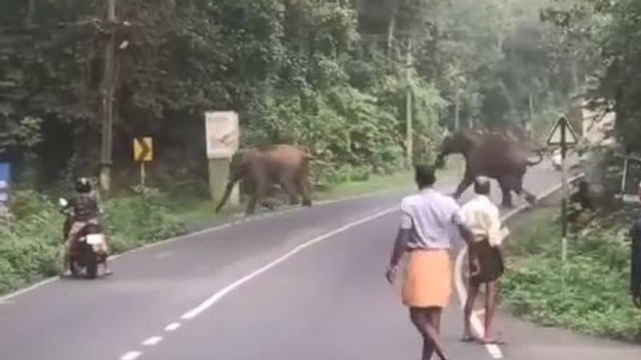 റോഡിന് ഒരു വശത്ത് കാട്ടാനകൾ നില്കുന്നത് കണ്ട് നാട്ടുകാര് ഇതുവഴിയെത്തി വാഹനങ്ങളോട് വിവരം പറയുന്നതും ഇതിനിടെ കൂളായി കാട്ടാന റോഡ് മുറിച്ച് കടന്ന് മറുവശത്തെ കാട്ടിലേക്ക് നടന്ന് പോവുന്നതിന്റെ ദൃശ്യങ്ങളും ഇതിനോടകം പുറത്ത് വന്നിട്ടുണ്ട്. ഒന്നിന് പിറകെ ഒന്നായി മൂന്ന് കൊമ്പന്മാരാണ് റോഡ് മുറിച്ച് കടന്നത്. രണ്ട് കാട്ടാനകള് കടന്നതിന് പിന്നാലെ വണ്ടിയെടുത്ത് മുന്നോട്ട് പോകുന്ന ബൈക്ക് യാത്രികനോട് മുന്നറിയിപ്പ് നല്കുന്ന നാട്ടുകാരനേയും വീഡിയോയില് കാണാം.