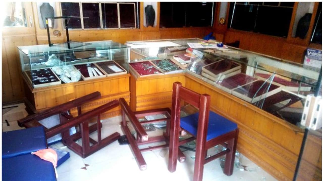 ചില്ല് കൊണ്ടുള്ള പ്രധാന വാതിലും, കബോഡ്, ഷോക്കേസ്, ത്രാസ്, കൗണ്ടറും കൈയ്യിലുണ്ടായിരുന്ന ആയുധം ഉപയോഗിച്ച് അടിച്ച് തകർത്ത ശേഷം പ്രദേശത്ത് യുവാവ് ഭീകരാന്തരീക്ഷം സൃഷ്ടിച്ചു. തുടർന്ന് ചേർത്തല പൊലീസെത്തി മനുവിനെ അറസ്റ്റ് ചെയ്തു. നഗരത്തിൽ ഓട്ടോ ഓടിയ്ക്കുന്ന മനു ഇതിന് മുമ്പും അക്രമാസ്തനാകാറുണ്ടെന്ന് ബന്ധുക്കൾ പറഞ്ഞു. അഞ്ച് ലക്ഷത്തോളം രൂപയുടെ നാശ നഷ്ടം വരുത്തീട്ടുണ്ടെന്ന് ഉടമ ജിതിൻ ജോൺ പറഞ്ഞു.