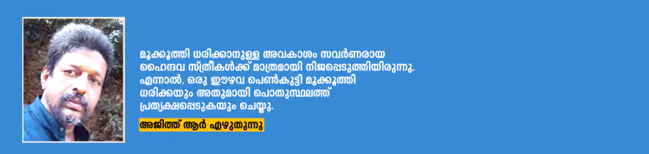 ആയിരത്തി എണ്ണൂറ്റി അറുപതു കാലത്താണ് പന്തളത്തു 'മൂക്കുത്തി വിപ്ലവം' അരങ്ങേറുന്നത്. അന്നത്തെ സാമൂഹ്യവ്യവസ്ഥിതിയനുസരിച്ച് ഓരോ ജാതിയിൽ പെട്ട ജനവിഭാഗത്തിനും ധരിക്കാവുന്ന വസ്ത്രത്തിനും ആഭരണങ്ങൾക്കും ഒക്കെ നിബന്ധനകൾ ഉണ്ടായിരുന്നു. അതിൽ മൂക്കൂത്തി ധരിക്കാനുള്ള അവകാശം സവർണരായ ഹൈന്ദവ സ്ത്രീകൾക്ക് മാത്രമായി നിജപ്പെടുത്തിയിരുന്നു. എന്നാൽ, ഒരു ഈഴവ പെൺകുട്ടി മൂക്കൂത്തി ധരിക്കുകയും അതുമായി പൊതുസ്ഥലത്ത് പ്രത്യക്ഷപ്പെടുകയും ചെയ്തു.