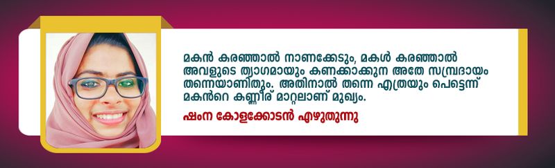 മകൻ കരഞ്ഞാൽ നാണക്കേടും, മകൾ കരഞ്ഞാൽ അവളുടെ ത്യാഗമായും കണക്കാക്കുന്ന അതേ സമ്പ്രദായം തന്നെയാണിതും. അതിനാൽ തന്നെ എത്രയും പെട്ടെന്ന് മകന്റെ കണ്ണീര് മാറ്റലാണ് മുഖ്യം. വീട്ടിലെ മുഖ്യസ്ഥാനവും നല്ലതെന്തും ആദ്യം ആൺമക്കൾക്ക് കൊടുക്കുന്ന അതേ സിസ്റ്റം തന്നെയാണിതും. മകനും മകളും തമ്മിൽ വഴക്കായാൽ "നീയൊന്നടങ്ങെടീ" എന്ന് മകളോട് അമ്മ കയർക്കുന്ന പോലെത്തന്നെയാണിത്. എന്തുവന്നാലും പെണ്ണാണെങ്കിൽ അങ്ങ് സഹിച്ചോണമെന്ന് പറഞ്ഞു പഠിപ്പിക്കുന്ന അമ്മ ഭാഷ്യം തന്നെയാണിത്.