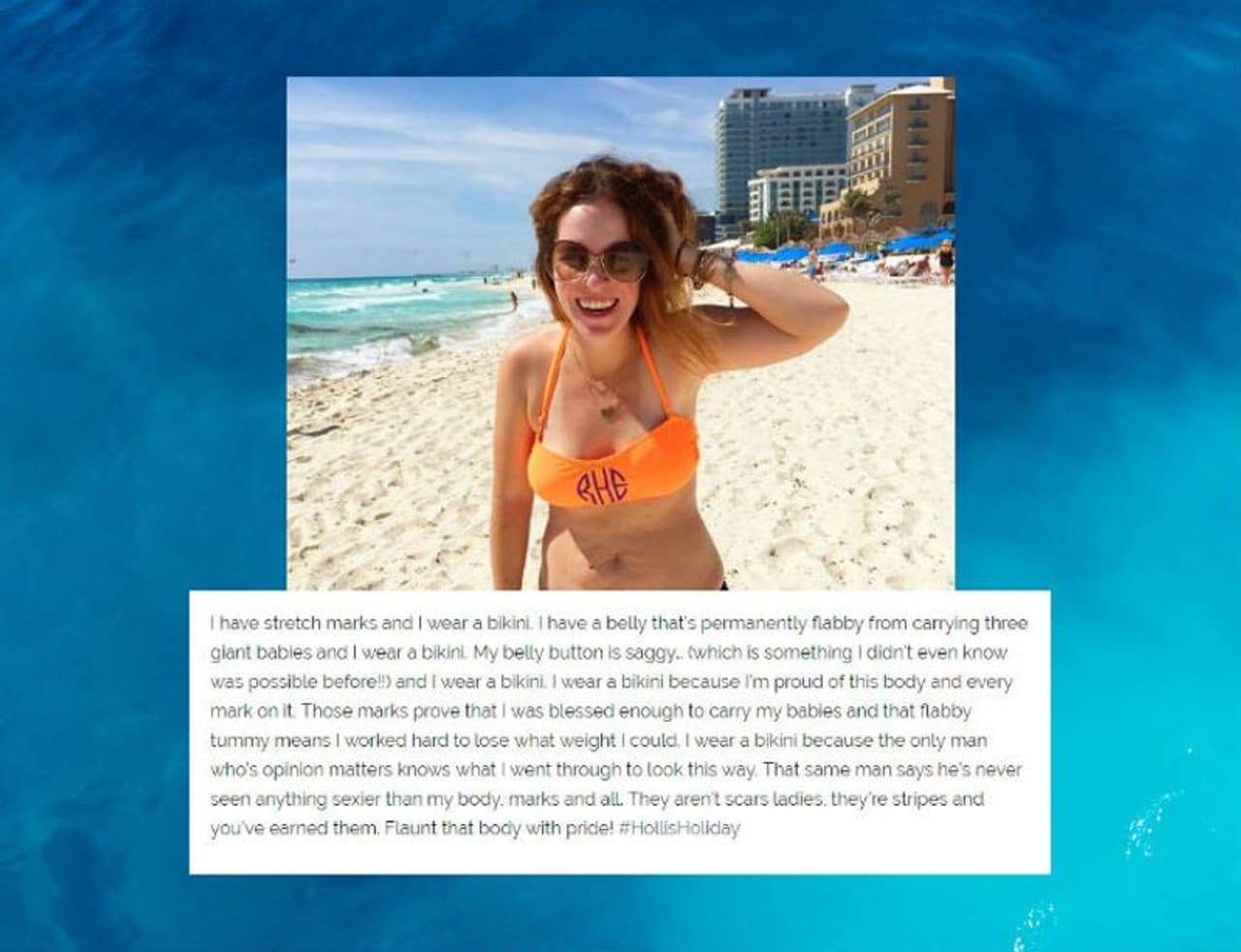 റേച്ചല് ഹോളിസ് ബിക്കിനി ധരിച്ച ഫോട്ടോ പോസ്റ്റ് ചെയ്തുകൊണ്ട് എഴുതുന്നത് 'മൂന്നു കുട്ടികള്ക്ക് ജന്മം നല്കിയതിലൂടെ ഉണ്ടായ പാടുകള് വീണ അടിവയര് മറച്ചു വെക്കാന് ഞാന് ഉദ്ദേശിക്കുന്നില്ല' എന്നാണ്.