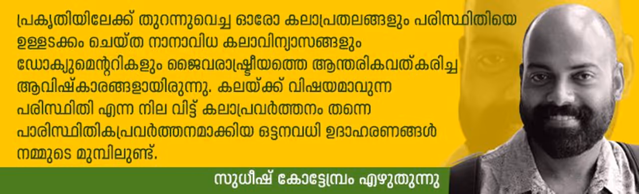 ഇവിടെ കലാകൃത്ത് ആര്ക്കിയോളജിസ്റ്റും ഇക്കോളജിസ്റ്റുമാണ്. ആക്റ്റിവിസ്റ്റും ആക്റ്ററുമാണ്. പരികര്മ്മിയും കര്ഷകനുമാണ്. മാറിനിന്ന് കാണാനുള്ള ടിക്കറ്റല്ല അയാള്ക്ക് പരിസ്ഥിതി. ഇടപെട്ട് നില്ക്കുന്നതിന്റെ പങ്കാളിത്തപരതയാണ്.