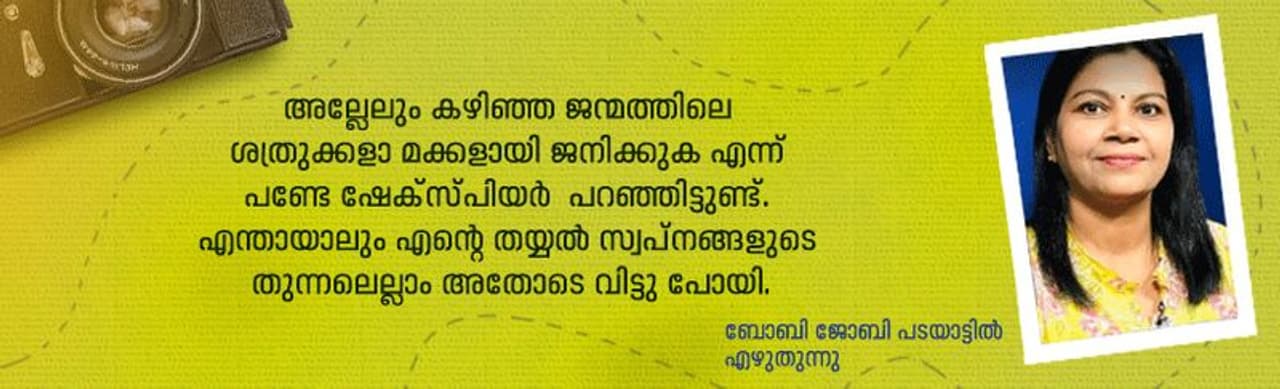അല്ലേലും കഴിഞ്ഞ ജന്മത്തിലെ ശത്രുക്കളാ മക്കളായി ജനിക്കുക എന്ന് പണ്ടേ ഷേക്സ്പിയര് പറഞ്ഞിട്ടുണ്ട്. എന്തായാലും എന്റെ തയ്യല് സ്വപ്നങ്ങളുടെ തുന്നലെല്ലാം അതോടെ വിട്ടു പോയി.