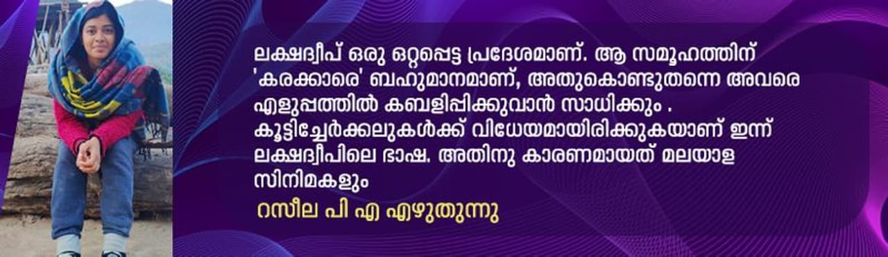 ലക്ഷദ്വീപ് ഒരു ഒറ്റപ്പെട്ട പ്രദേശമാണ്. ആ സമൂഹത്തിന് 'കരക്കാരെ' ബഹുമാനമാണ്, അതുകൊണ്ടുതന്നെ അവരെ എളുപ്പത്തിൽ കബളിപ്പിക്കുവാൻ സാധിക്കും . കൂട്ടിച്ചേർക്കലുകൾക്ക് വിധേയമായിരിക്കുകയാണ് ഇന്ന് ലക്ഷദ്വീപിലെ ഭാഷ. അതിനു കാരണമായത് മലയാള സിനിമകളും. 'ഹണി ബീ' എന്ന സിനിമയാണ് ലക്ഷദ്വീപിൽ ചിത്രീകരിച്ച ആദ്യത്തെ സിനിമ. അതിനുമുമ്പൊന്നും അവിടെ സിനിമാ ചിത്രീകരണത്തിന് അനുമതി ലഭിച്ചിരുന്നില്ല. പിന്നീട് 'മോസയിലെ കുതിരമീനുകൾ', 'അനാർക്കലി','പ്രണയമീനുകളുടെ കടൽ', ഏറ്റവും ഒടുവിൽ ‘മൂത്തോനും’ ലക്ഷദ്വീപിൽ വച്ച് ചിത്രീകരിക്കപ്പെടുകയുണ്ടായി.