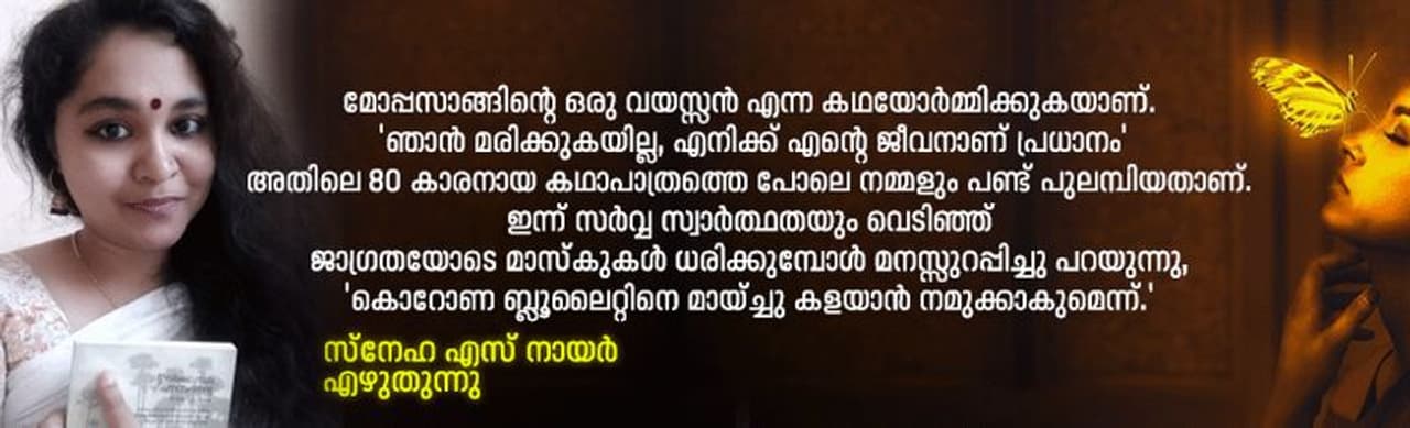 ഓര്മ്മയിലിപ്പോള് മോപ്പസാങ്ങിന്റെ ആ വയസ്സന് കഥാപാത്രം. 'ഞാന് മരിക്കുകയില്ല, എനിക്ക് എന്റെ ജീവനാണ് പ്രധാനം.' അതിലെ 80 -കാരനായ കഥാപാത്രത്തെ പോലെ നമ്മളുമെത്ര പുലമ്പിയിട്ടുണ്ട് ആ വാക്കുകള്. സര്വ്വ സ്വാര്ത്ഥതയും വെടിഞ്ഞ് ജാഗ്രതയോടെ മാസ്കുകള് ധരിക്കുമ്പോള് ഇന്ന് മനസ്സുറപ്പിച്ചു പറയുന്നു, 'കൊറോണ ബ്ലൂലൈറ്റിനെയും മായ്ച്ചു കളയാന് നമുക്കിന്നാകും.