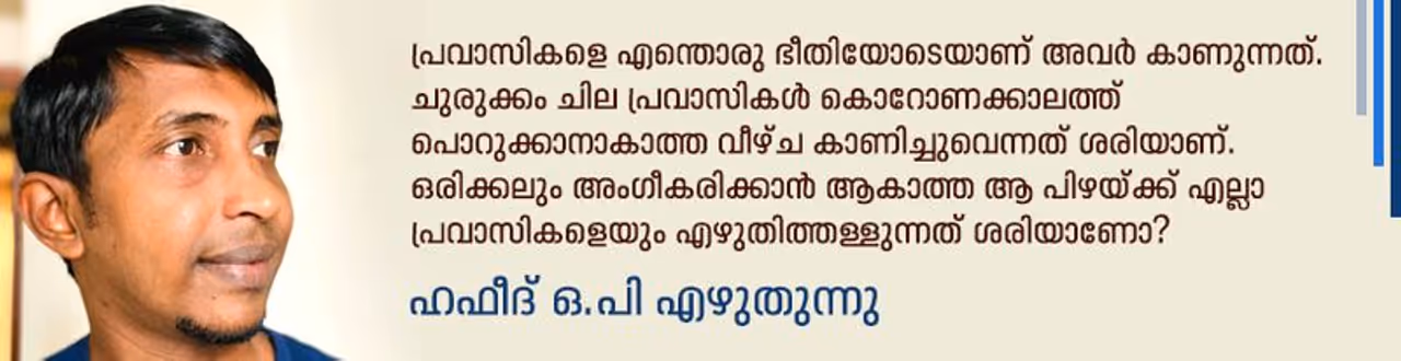 പ്രവാസികളെ എന്തൊരു ഭീതിയോടെയാണ് അവർ കാണുന്നത്. ചുരുക്കം ചില പ്രവാസികൾ കൊറോണക്കാലത്ത് പൊറുക്കാനാകാതെ വീഴ്ച കാണിച്ചുവെന്നത് ശരിയാണ്. ഒരിക്കലും അംഗീകരിക്കാൻ ആകാത്ത ആ പിഴയ്ക്ക് എല്ലാ പ്രവാസികളെയും എഴുതിത്തള്ളുന്നത് ശരിയാണോ എന്ന് മനസാക്ഷിയുടെ കോടതിയിൽ നിങ്ങൾ വിചാരണ ചെയ്തു നോക്കണം. നാട്ടിലേക്ക് മടങ്ങിയെത്താൻ കൊതിച്ച് വിമാന സർവീസുകൾ അവസാനിക്കുന്നതിനു മുൻപ് എത്തിയ മറ്റെല്ലാവരും എല്ലാ നിരീക്ഷണങ്ങൾക്കും മനസ് തുറന്നു സമ്മതം അറിയിച്ചത് നമ്മൾ കണ്ടതാണ്. എന്നിട്ടും പ്രവാസികളെ ഭയത്തോടെ നോക്കുന്നു. എന്തിനാണ് ഇപ്പോൾ നാട്ടിൽ വന്നത്? കൊറോണ കേരളത്തിൽ പടർത്തിയത് 'ദുബായ്ക്കാർ', എന്നൊക്കെയാണ് ഇപ്പോൾ നാട്ടിലുള്ള ഞങ്ങൾ പ്രവാസികൾക്ക് കേൾക്കേണ്ടി വരുന്ന കുത്തുവാക്കുകൾ. പണ്ടൊക്കെ നാട്ടിൽ വന്നാൽ ആദ്യ ദിവസം കാണുമ്പോൾ തന്നെ എപ്പഴാ മടങ്ങി പോകുന്നത് എന്ന് ചോദിക്കുന്ന ഔചിത്യബോധമില്ലാത്ത കുറച്ചുപേർ ഉണ്ടായിരുന്നു. അതവർക്ക് ഒരു മനസുഖം എന്ന് കരുതി അവഗണിക്കാറായിരുന്നു പതിവ്. പക്ഷേ, ഇപ്പോഴത്തെ ചോദ്യങ്ങളും കുത്തുവാക്കുകളും വലിയ വേദനയായി മാറുകയാണ്.