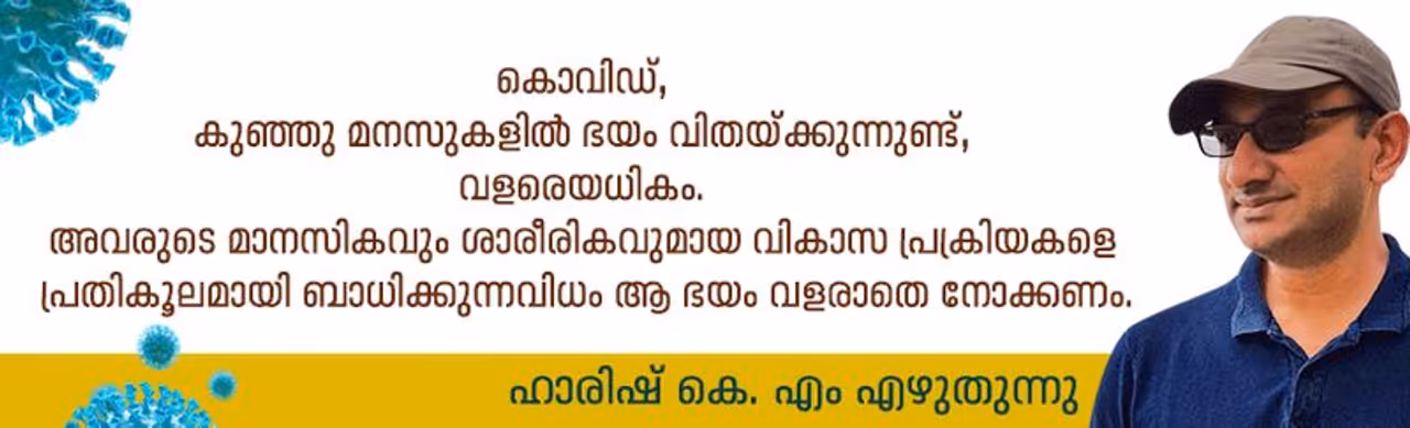 കൊവിഡ്, കുഞ്ഞു മനസുകളിൽ ഭയം വിതയ്ക്കുന്നുണ്ട്, വളരെയധികം. അവരുടെ മാനസികവും ശാരീരികവുമായ വികാസ പ്രക്രിയകളെ പ്രതികൂലമായി ബാധിക്കുന്ന വിധം ആ ഭയം വളരാതെ നോക്കണം. അവർക്ക് ഏറ്റവുമധികം സപ്പോർട്ട് ആവശ്യമുള്ള ഘട്ടമാണിത്. അവരോട് സംസാരിക്കണം. കൊവിഡ് എന്താണെന്ന് പറഞ്ഞുകൊടുക്കണം. അതിൽനിന്ന് എങ്ങനെ സുരക്ഷിതരായിരിക്കാം എന്ന് പറയണം. ഭയം വേണ്ട, കരുതൽ ഉണ്ടായാൽ മതി എന്ന് ബോധ്യപ്പെടുത്തണം.