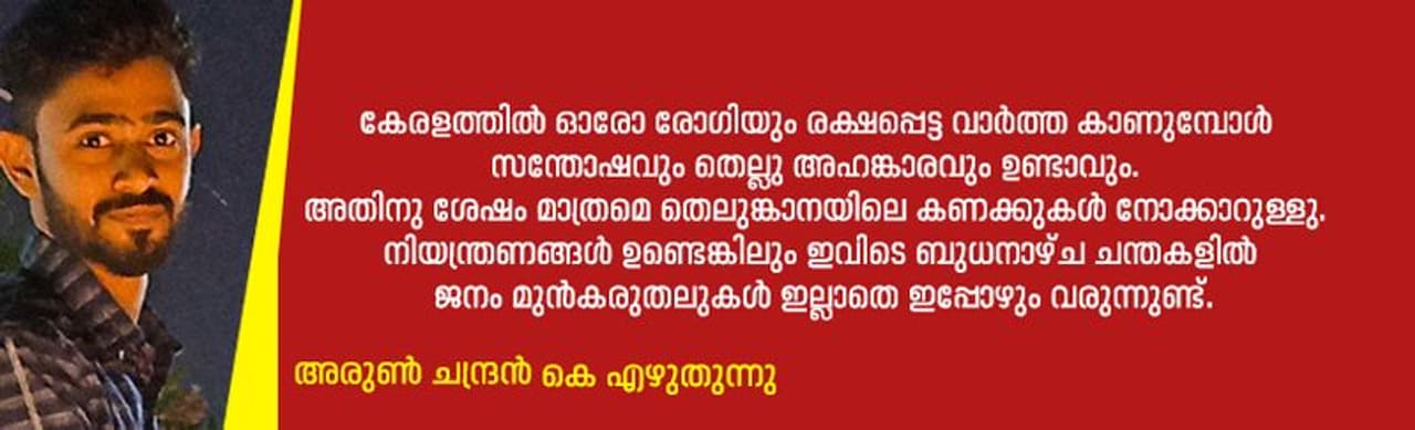 ഞാന് ഇതെഴുതുമ്പോള് തെലുങ്കാനയിലെ രോഗികളുടെ എണ്ണം 1000 കവിയുന്നു , ആശങ്കകള്ക്ക് നടുവിലും പ്രതീക്ഷ കൈവിടാതെ നമുക്ക് ഒരുമിച്ച് പൊരുതാം. എല്ലാ പ്രതിസന്ധികളും അതിജീവിച്ച് ഇനിയും നമ്മള് മുന്പോട്ടു പോകും. അപ്പോള് നാട്ടില് വരണം.