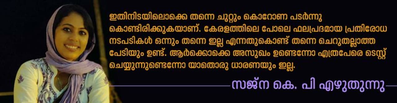 കൊറോണക്കാലം. ആർക്കൊക്കെ അസുഖമുണ്ടെന്നോ എത്രപേരെ ടെസ്റ്റ് ചെയ്യുന്നുണ്ടെന്നോ അറിയില്ല, ഒരു നല്ല ആശുപത്രിയില്ല, എന്നിട്ടും.. സജ്ന കെ.പി എഴുതുന്നു.
