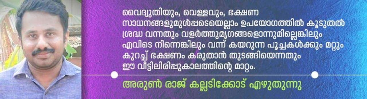 നാട്ടിലെ വായനശാലയുടെ ഫേസ്ബുക്ക് പേജിലൂടെ ബാലസാഹിത്യ കൃതികള് പരിചയപ്പെടുത്തുന്ന ഒരു പംക്തി തുടങ്ങി. നേരിട്ടും സോഷ്യല് മീഡിയയിലൂടെയും പരിചയമുള്ളവരില് നിന്നെല്ലാം കുട്ടികള്ക്കുള്ള പുസ്തക പരിചയക്കുറിപ്പുകള് വാങ്ങി പോസ്റ്റ് ചെയ്യാനും തുടങ്ങി. വൈദ്യുതിയും, വെള്ളവും, ഭക്ഷണ സാധനങ്ങളുമുള്പ്പടെയെല്ലാം ഉപയോഗത്തില് കൂടുതല് ശ്രദ്ധ വന്നതും വളര്ത്തുമൃഗങ്ങളൊന്നുമില്ലെങ്കിലും എവിടെ നിന്നെങ്കിലും വന്ന് കയറുന്ന പൂച്ചകള്ക്കും മറ്റും കുറച്ച് ഭക്ഷണം കരുതാന് തുടങ്ങിയെന്നതും ഈ വീട്ടിലിരിപ്പുകാലത്തിന്റെ മാറ്റം.