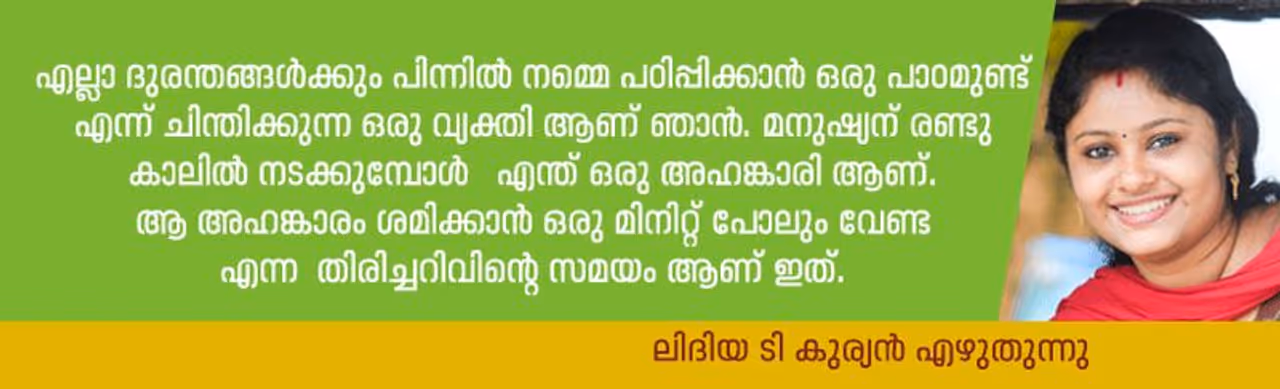 എല്ലാ ദുരന്തങ്ങള്ക്കും പിന്നില് നമ്മെ പഠിപ്പിക്കാന് ഒരു പാഠമുണ്ട് എന്ന് ചിന്തിക്കുന്ന ഒരു വ്യക്തി ആണ് ഞാന്. മനുഷ്യന് രണ്ടു കാലില് നടക്കുമ്പോള് എന്ത് ഒരു അഹങ്കാരി ആണ്. ആ അഹങ്കാരം ശമിക്കാന് ഒരു മിനിറ്റ് പോലും വേണ്ട എന്ന തിരിച്ചറിവിന്റെ സമയം ആണ് ഇത്. പണവും പദവിയും നോക്കുകുത്തിയായി നിസ്സഹായതയോടെ നില്ക്കുന്ന സമയം. എന്തൊക്കെ സമ്പാദിച്ചു കൂട്ടിയാലും വെട്ടിപിടിച്ചാലും, എത്രയൊക്കെ ഉണ്ടെന്ന് പറയുന്നവനും കോവിഡ് ഒരു ഊരാക്കുടുക് തന്നെ. ഇനി എങ്കിലും മനുഷ്യര് പരസ്പരം മനസ്സിലാക്കിയും പങ്കുവെച്ചും ജീവിക്കാന് പഠിക്കട്ടെ. വലിയവന് ആയാലും, ചെറിയവന് ആയാലും, സമ്പന്നന് ആയാലും, വിധിയുടെ മുമ്പില് വെറും കളിപ്പാട്ടങ്ങള് മാത്രം.