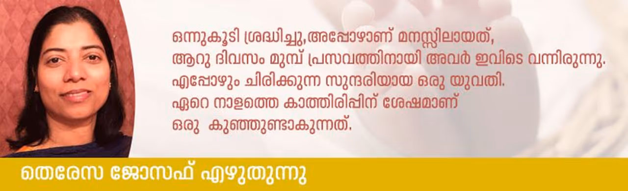 ഒന്നുകൂടി ശ്രദ്ധിച്ചു,അപ്പോഴാണ് മനസ്സിലായത്, ആറു ദിവസം മുമ്പ് പ്രസവത്തിനായി അവര് ഇവിടെ വന്നിരുന്നു. എപ്പോഴും ചിരിക്കുന്ന സുന്ദരിയായ ഒരു യുവതി. ഏറെ നാളത്തെ കാത്തിരിപ്പിന് ശേഷമാണ് ഒരു കുഞ്ഞുണ്ടാകുന്നത്. അവളുടെ ഭര്ത്താവിനെയും എനിക്കോര്മ്മ വന്നു. ശാന്തനായ മനുഷ്യന്. കുഞ്ഞ് കരയുമ്പോള് നെഞ്ചിലേക്ക് ചേര്ത്തുപിടിച്ച് അയാള് പതുക്കെ താളം പിടിക്കും. അമ്മയുടെയും അച്ഛന്റെയും ചൂടുപറ്റി ശാന്തമായി ഉറങ്ങുന്ന ഒരു കുഞ്ഞു മാലാഖ.