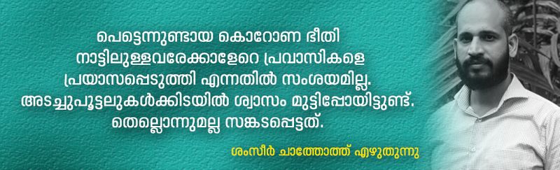 പെട്ടെന്നുണ്ടായ കൊറോണ ഭീതി നാട്ടിലുള്ളവരേക്കാളേറെ പ്രവാസികളെ പ്രയാസപ്പെടുത്തി എന്നതില് സംശയമില്ല. അടച്ചുപൂട്ടലുകള്ക്കിടയില് ശ്വാസം മുട്ടിപ്പോയിട്ടുണ്ട്. തെല്ലൊന്നുമല്ല സങ്കടപ്പെട്ടത്. ഇന്നല്ലെങ്കില് നാളെ, നാളെയല്ലെങ്കില് മറ്റൊരുനാള്, അങ്ങനെ ഓരോ ദിവസവും പ്രയാസപ്പെട്ട് കടിച്ചമര്ത്തി ഉള്ളിലൊതുക്കി കഴിഞ്ഞു. എന്താണ് സംഭവിക്കുന്നതെന്ന് യാതൊരു ബോധവുമില്ലാത്ത ഭീകരമായ ഒരു അവസ്ഥ. ആദ്യ ഘട്ടങ്ങളിലൊക്കെ കൊറോണ ഭയാനകമായ ഒരു ചിത്രമായിരുന്നു ഉള്ളില് നിറച്ചത്.