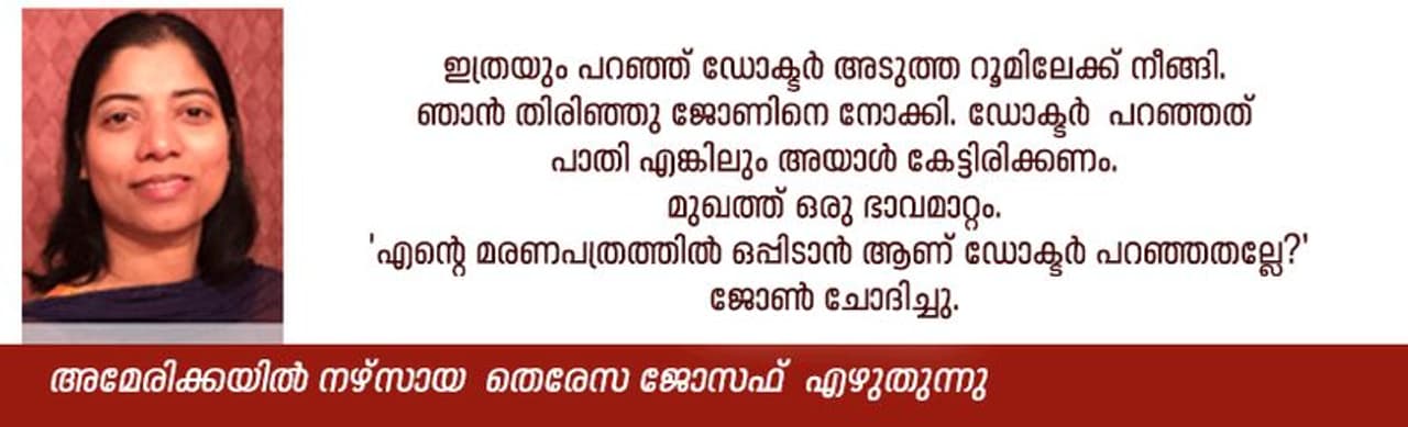ഇത്രയും പറഞ്ഞ് ഡോക്ടര് അടുത്ത റൂമിലേക്ക് നീങ്ങി. ഞാന് തിരിഞ്ഞു ജോണിനെ നോക്കി. ഡോക്ടര് പറഞ്ഞത് പാതി എങ്കിലും അയാള് കേട്ടിരിക്കണം. മുഖത്ത് ഒരു ഭാവമാറ്റം. 'എന്റെ മരണപത്രത്തില് ഒപ്പിടാന് ആണ് ഡോക്ടര് പറഞ്ഞതല്ലേ?'-ജോണ് ചോദിച്ചു.