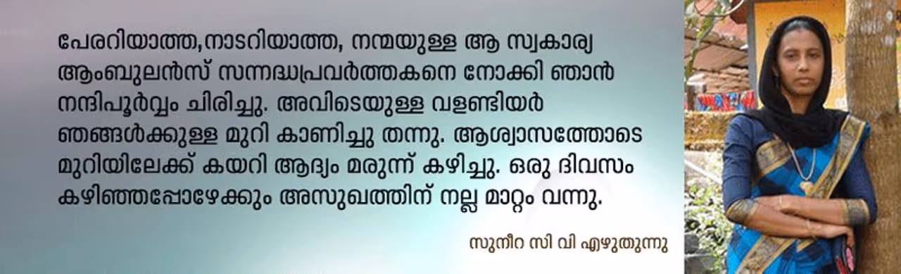 പേരറിയാത്ത, നാടറിയാത്ത, നന്മയുള്ള ആ സ്വകാര്യ ആംബുലന്സ് സന്നദ്ധപ്രവര്ത്തകനെ നോക്കി ഞാന് നന്ദിപൂര്വ്വം ചിരിച്ചു. അവിടെയുള്ള വളണ്ടിയര്