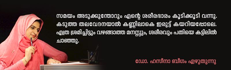 വീട്ടിലെത്തിയ ഞാന് ഒരു റൂമില് തനിച്ചായി. രണ്ട് ആഴ്ചകളോളം പനി കാരണം പൊടിയരി കഞ്ഞി മാത്രം കഴിച്ച എനിക്ക് ഒന്നും കഴിക്കാനും പറ്റുന്നില്ല. അതോടെ വയറിളക്കമായി. പനി,തലവേദന, ശ്വാസതടസം ഒപ്പം വയറിളക്കവും. ഒറ്റക്ക് റൂമില് കിടക്കേണ്ടി വന്നില്ല. അധികവും വാഷ് റൂമില്. ഭര്ത്താവിന്റെയും മകന്റെയും ടെന്ഷന് കൂടി. ഒന്നിനും പറ്റാത്ത അവസ്ഥ. ഒരു പോള കണ്ണടക്കാതെ ഒരു രാത്രി മൂന്നു പേരും തള്ളി നീക്കി. ഓരോരോ സാധനങ്ങള് ഇരിക്കുന്ന സ്ഥലങ്ങള് ഞാന് അദ്ദേഹത്തോട് പറയാന് തുടങ്ങി. പാസ്പോര്ട്ട്, സ്കൂളിലെ താക്കോല്ക്കൂട്ടം, സര്ട്ടിഫിക്കറ്റുകള്, അങ്ങനെ വിലപ്പെട്ടതെല്ലാം. എല്ലാം പറയുമ്പോഴും ഞാന് കരയുന്നുണ്ട്. അദ്ദേഹം ഫ്ളാറ്റില് തലയും മാന്തി അങ്ങോട്ടുമിങ്ങോട്ടും നടക്കുന്നു. ആ സ്നേഹം, കരുതല് എല്ലാം എനിക്ക് ബോധ്യമായി. ഇനിയും സഫലീകരിക്കാത്ത എന്റെ ചില സ്വപ്നങ്ങള്, മകന്റെ കല്യാണം അങ്ങനെയങ്ങനെ മനസ്സില് ഓടിവന്നു.