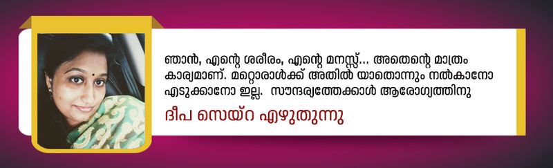5. ഞാൻ, എന്റെ ശരീരം, എന്റെ മനസ്സ്... അതെന്റെ മാത്രം കാര്യമാണ്. മറ്റൊരാൾക്ക് അതിൽ യാതൊന്നും നൽകാനോ എടുക്കാനോ ഇല്ല. സൗന്ദര്യത്തേക്കാൾ ആരോഗ്യത്തിനു പ്രാധാന്യം കൊടുക്കാം. കണ്ണാടിയിൽ നോക്കി "i am healthy, i am beautiful inside and outside" എന്നൊന്ന് ഉറക്കെ പറയാം. ഓടി നടക്കാൻ ബലമുള്ള കാലുകളും മറ്റുള്ളവരെ സഹായിക്കാൻ ഉറപ്പുള്ള കൈകളും, അത് ചെയ്യാനുള്ള മനസും മാത്രം മതി സുന്ദരിയാവാൻ എന്ന് ഉറച്ചു വിശ്വസിക്കുക.