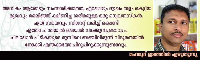 കുറച്ച് വര്ഷങ്ങള്ക്ക് മുമ്പായിരുന്നു ഞാന് അയാളെ പരിചയപ്പെട്ടത്. അത്രയൊന്നും വൃത്തിയില്ലാത്ത, ടൗണില് നിന്ന് വളരെ അകലെയുള്ള, ലേബര് ക്യാമ്പിലെ ഷോപ്പിലായിരുന്നു ഞാന് ജോലി ചെയ്തിരുന്നത്. അതിന്റെ അടുത്ത് തന്നെയാണ് അയാളുടെ കടയും. ഏകദേശം 50 വയസ്സ് തോന്നിക്കും. അധികം ആരോടും സംസാരിക്കാത്ത, എപ്പോഴും ദു:ഖം തളം കെട്ടിയ മുഖവും മെലിഞ്ഞ് ക്ഷീണിച്ച ശരീരമുള്ള ഒരു മധ്യവയസ്കന്. ഏത് സമയവും സിഗററ്റ് വലിച്ച് കൊണ്ട് ഏതോ ചിന്തയില് അയാള് നടക്കുന്നുണ്ടാവും. ചിലപ്പോള് പീടികയുടെ മുമ്പിലെ ബഞ്ചിലിരുന്ന് വിദൂരയില് നോക്കി എന്തക്കയോ പിറുപിറുക്കുന്നുണ്ടാവും.