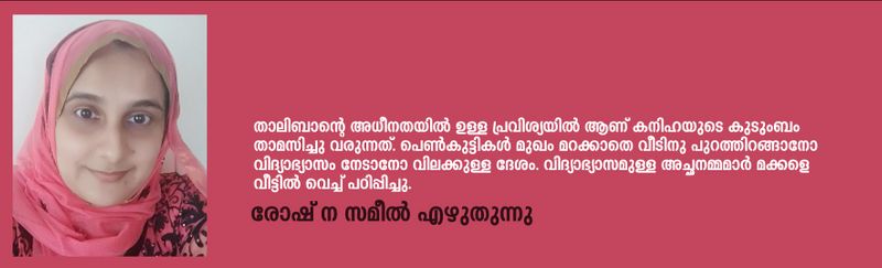 താലിബാന്റെ അധീനതയില് ഉള്ള പ്രവിശ്യയില് ആണ് കനിഹയുടെ കുടുംബം താമസിച്ചു വരുന്നത്. പെണ്കുട്ടികള് മുഖം മറക്കാതെ വീടിനു പുറത്തിറങ്ങാനോ വിദ്യാഭ്യാസം നേടാനോ വിലക്കുള്ള ദേശം. വിദ്യാഭ്യാസമുള്ള അച്ഛനമ്മമാര് മക്കളെ വീട്ടില് വെച്ച് പഠിപ്പിച്ചു.