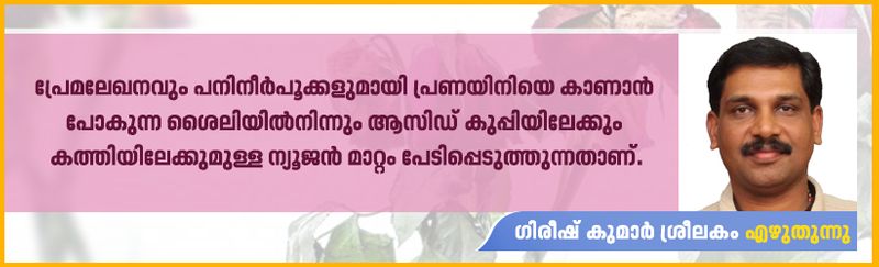 പ്രേമലേഖനവും പനിനീര്പൂക്കളുമായി പ്രണയിനിയെ കാണാന് പോകുന്ന ശൈലിയില്നിന്നും ആസിഡ് കുപ്പിയിലേക്കും കത്തിയിലേക്കുമുള്ള ന്യൂജന് മാറ്റം പേടിപ്പെടുത്തുന്നതാണ്. സ്നേഹിക്കുന്നയാള്ക്കുവേണ്ടി ജീവന് ത്യജിച്ച കഥകളിലെ കഥാപാത്രങ്ങള് അവരുടെ വായനയുടെയും കാഴ്ചയുടെയും പരിധിയില് വരുന്നതേയില്ല. തോറ്റുകൊടുത്തവര് അവരുടെ കണ്ണില് വിഡ്ഢികളാണ്. കൊതിച്ചതൊക്കെ പിടിച്ചടക്കി കൊലവിളി നടത്തുന്ന നായക വേഷങ്ങള് അവരിലെ ഹീറോയിസ സങ്കല്പ്പത്തെ അപനിര്മ്മിച്ചു മാറ്റിവരച്ചിരിക്കുന്നു. നായകന് ഒരിക്കലും തോല്ക്കില്ലെന്നാണ് അവരുടെ വിശ്വാസം. തോല്ക്കുന്നവന് നായകനല്ലെന്നും പ്രതിനായകന് മാത്രമാണെന്നും; ഒരിക്കല് തോറ്റുപോയാല് പ്രതിനായകന്റെ നിലയിലേക്കു താണു പ്രതികാരം ചെയ്യണമെന്നുമുള്ള വികല വീക്ഷണം നമ്മുടെ യുവജനങ്ങളുടെ ബോധമണ്ഡലത്തെ കാര്ന്നുതിന്നുന്നതിന് അവരെ ആ ചിന്തകളിലൂടെ കൈപിടിച്ചു നടത്തിയവരെല്ലാം ഉത്തരവാദികളാണ്. ആരാണ് ഉത്തരവാദി എന്നതല്ല ഇവിടത്തെ അടിയന്തര പ്രശ്നം. ആര് നമ്മുടെ കുഞ്ഞുങ്ങള്ക്ക് സ്നേഹത്തിന്റെ ഭാഷ പഠിപ്പിച്ചുകൊടുക്കും എന്നതാണ്.