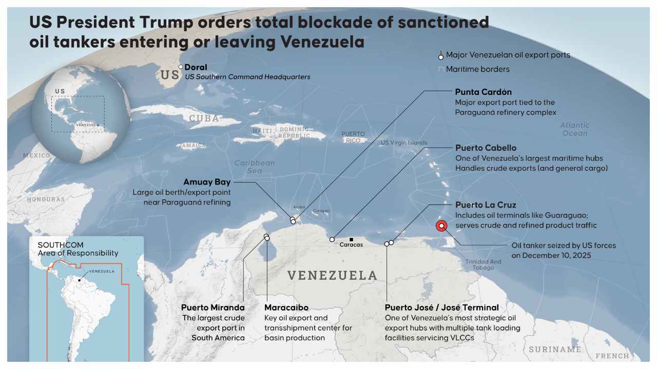 യുഎസ് വെനിസ്വേലയുടെ എണ്ണ ടാങ്കർ പിടിച്ചെടുത്തു, ഇത് പടിഞ്ഞാറൻ ഗോളാർദ്ധത്തിൽ സ്വാധീനം ഉറപ്പിക്കാനുള്ള 'മൺറോ ഡോക്ട്രിൻ' നയത്തിൻറെ പുനരുജ്ജീവനമായി വിലയിരുത്തുന്നു. യുഎസിൻറെ യഥാർത്ഥ ലക്ഷ്യം ലോകത്തിലെ ഏറ്റവും വലിയ എണ്ണ സമ്പത്തിലാണെന്ന് വെനിസ്വേല.