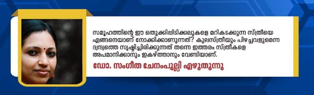 കുലസ്ത്രീയും പിഴച്ചവളുമെന്ന ദ്വന്ദ്വത്തെ സൃഷ്ടിച്ചിരിക്കുന്നത് തന്നെ ഇത്തരം സ്ത്രീകളെ അപമാനിക്കാനും ഇകഴ്ത്താനും വേണ്ടിയാണ്. ഡോ. സംഗീത ചേനംപുല്ലി എഴുതുന്നു