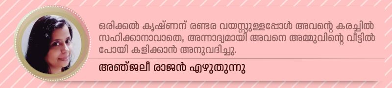 ഒരിക്കൽ കൃഷ്ണന് രണ്ടര വയസ്സുള്ളപ്പോൾ അവന്റെ കരച്ചിൽ സഹിക്കാനാവാതെ, അന്നാദ്യമായി അവനെ അമ്മുവിന്റെ വീട്ടിൽ പോയി കളിക്കാൻ അനുവദിച്ചു. അവിടെ അമ്മുവിന്റെ അമ്മയുണ്ടായിരുന്നിട്ടും, എന്റെ മനസ്സ് ആകെ അസ്വസ്ഥമായിരുന്നു.