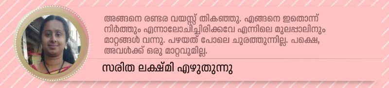 അങ്ങനെ രണ്ടര വയസ്സ് തികഞ്ഞു. എങ്ങനെ ഇതൊന്ന് നിർത്തും എന്നാലോചിച്ചിരിക്കവേ എന്നിലെ മുലപ്പാലിനും മാറ്റങ്ങൾ വന്നു. പഴയത് പോലെ ചുരത്തുന്നില്ല. പക്ഷെ, അവൾക്ക് ഒരു മാവുമില്ല. ഒരു ദിവസം ആ മാറ്റം അവൾ തിരിച്ചറിഞ്ഞു. അവൾ എന്റെ രണ്ടു മാറിടങ്ങളിൽ മാറി മാറി നോക്കി എന്നേയും ഒരു ചോദ്യ ചിഹ്നമെന്നപോൽ നോക്കി. അവളുടെ നോട്ടം എന്നിൽ ചിരിയും സങ്കടവും ഒരു പോലെ നിറച്ചു. എനിക്ക് മനസ്സിലായി അവൾ 'ഇതെന്താ നിന്ന് പോയത്' എന്ന് എന്നോട് ചോദിച്ചതാണെന്ന്.