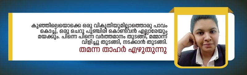 കുഞ്ഞിലെയൊക്കെ ഒരു വികൃതിയുമില്ലാത്തൊരു പാവം കൊച്ച്, ഒരു ചെറു പുഞ്ചിരി കൊണ്ടവൻ എല്ലാരേയും മയക്കും. പിന്നെ പിന്നെ വർത്തമാനം തുടങ്ങി, മമ്മാന്ന് വിളിച്ചു തുടങ്ങി, നടക്കാൻ തുടങ്ങി, അപ്പോഴൊക്കെയും ഇത് പോലെ പാവം കുഞ്ഞിനെ വേറെ കണ്ടിട്ടില്ല. സ്കൂളിൽ പോകാൻ തുടങ്ങിയപ്പോ മുതലവൻ മാറാൻ തുടങ്ങി. വർത്തമാനത്തിന്റെ അളവ് കൂടി ( മത്തൻ കുത്തിയാൽ കുമ്പളം മുളക്കില്ല എന്ന് വീട്ടുകാർ പറഞ്ഞ് തുടങ്ങി ). അവനായിട്ട് ഓരോ കഥയുണ്ടാക്കി ഓരോ പടം വരക്കും, അതിന്റെയൊക്കെ കഥ എപ്പോഴും കള്ളനും പോലീസും സൂപ്പർമാനും ഒക്കെയായിരുന്നു. കളിപ്പാട്ടത്തിനേക്കാൾ ഇഷ്ടം സോപ്പ് പൊടി വെള്ളത്തിലിട്ട് അവന്റെ ചെറിയ കാറും ചെറിയ കളിപ്പാട്ടം കഴുകലും ഒക്കെയായിരുന്നു. സ്വന്തമായിട്ടൊരു സ്ഥലം അവന്റേതായിട്ട് അവനുണ്ടാക്കും, അവിടാണ് പിന്നെ കളിയൊക്കെയും.