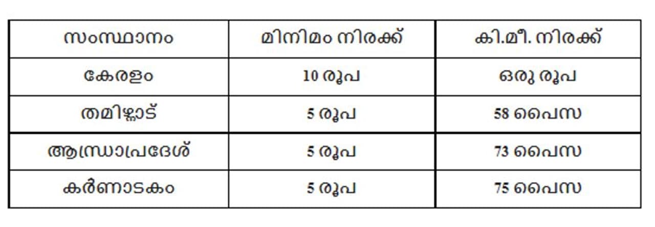 കേരളത്തിലെ ബസ് ചാര്ജും അയല് സംസ്ഥാനങ്ങളിലെ ചാര്ജും താരതമ്യം ചെയ്യാം; മിനിമം നിരക്കിന്റെ കാര്യത്തില് നമ്മുടെത് ഇരട്ടിയാണ്. നാം 10 രൂപ ഈടാക്കുമ്പോള് അയല് സംസ്ഥാനങ്ങള് 5 രൂപയേ ഈടാക്കുന്നുള്ളു. കേരളം കിലോമീറ്ററിന് ഒരു രൂപ വാങ്ങുമ്പോള് അയല് സംസ്ഥാനങ്ങളില് അത് 58 പൈസ മുതല് 75 പൈസ വരെയാണ്. തമിഴ്നാട്ടിലാകട്ടെ സ്തീകള്ക്കും വിദ്യര്ത്ഥികള്ക്കുമെമെല്ലാം യാത്ര സൗജന്യവുമാണ്.