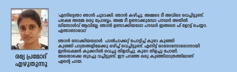 'എന്നിട്ടെന്താ ഞാന് ചൂടാക്കി. ഞാന് കഴിച്ചു. അമ്മടെ ടീ അവിടെ വെച്ചിട്ടുണ്ട്. പക്ഷെ അമ്മേ ഒരു പ്രോബ്ലം. അമ്മ ടീ ഉണ്ടാക്കുമ്പോ പൗഡര് അതില് ഡിസോള്വ് ആവില്ലേ, ഞാന് ഉണ്ടാക്കിയപ്പോ പൗഡര് ഇങ്ങനെ ഫ്ളോട്ട് ചെയ്യാ. എന്താണാവോ'