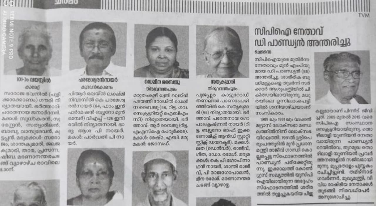 ഡി പാണ്ഡ്യന്റെ മരണവാര്ത്ത ദേശാഭിമാനി പത്രത്തിന്റെ ചരമപേജില്