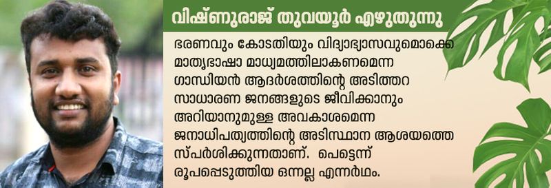 ഭരണവും കോടതിയും വിദ്യാഭ്യാസവുമൊക്കെ മാതൃഭാഷാ മാധ്യമത്തിലാകണമെന്ന ഗാന്ധിയന് ആദര്ശത്തിന്റെ അടിത്തറ സാധാരണ ജനങ്ങളുടെ ജീവിക്കാനും അറിയാനുമുള്ള അവകാശമെന്ന ജനാധിപത്യത്തിന്റെ അടിസ്ഥാന ആശയത്തെ സ്പര്ശിക്കുന്നതാണ്.