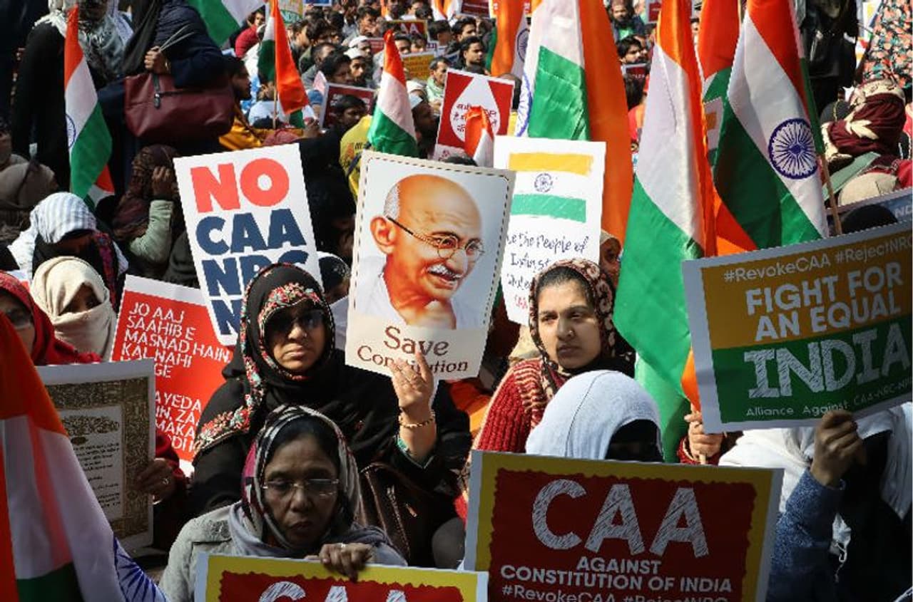 ദില്ലിയിലെ ജന്ദര്മന്ദറില് നടന്ന സി എ എ വിരുദ്ധ പ്രക്ഷോഭത്തിനിടെ മഹാത്മാ ഗാന്ധിയുടെ ഛായാചിത്രവുമായി മുദ്രാവാക്യങ്ങള് വിളിക്കുന്നവര്. ഫോട്ടോ: ടി നാരായണ് / ഗെറ്റിഇമേജസ്